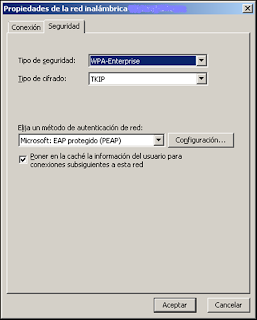 3. En propiedades de red inalámbrica, elejimos como método en autenticación como PEAP